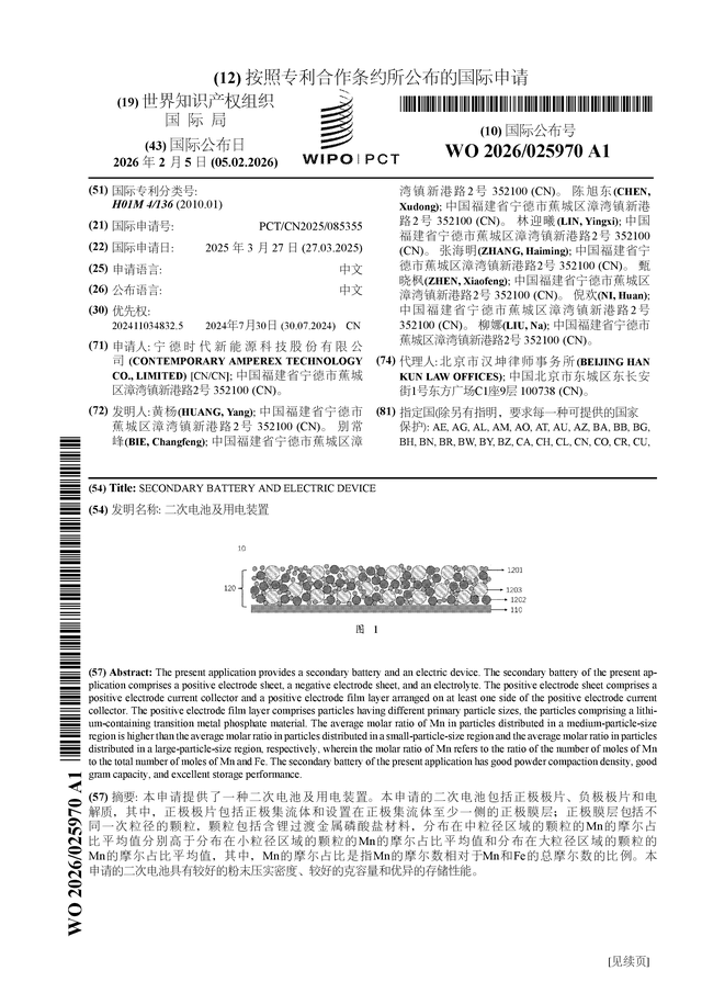 证券之星音问,字据企查查数据走漏宁德时间(300750)公布了一项海外专利肯求,专利名为“二次电板及用电安设”,专利肯求号为PCT/CN2025/085355,海外公布日为2026年2月5日。